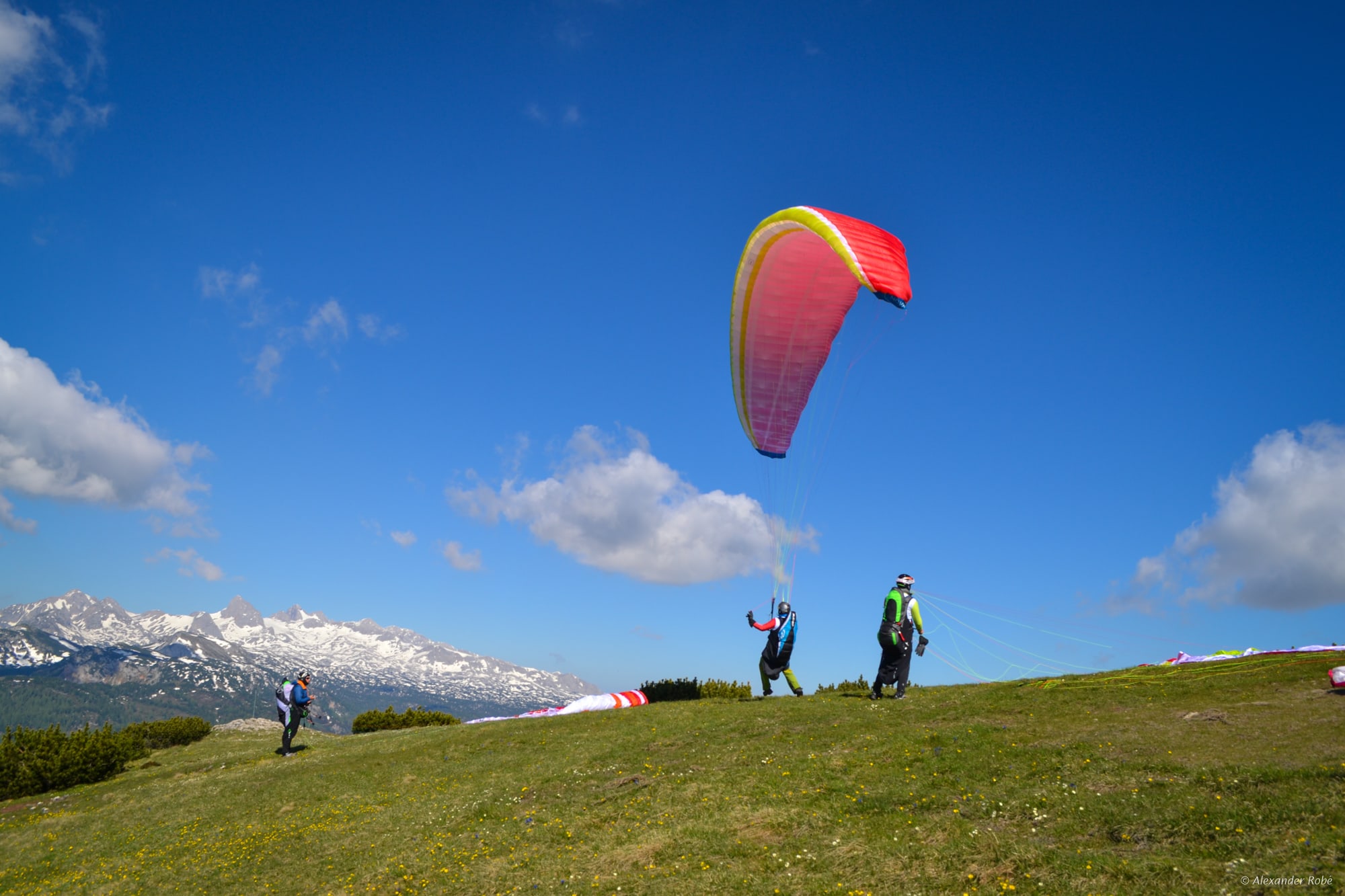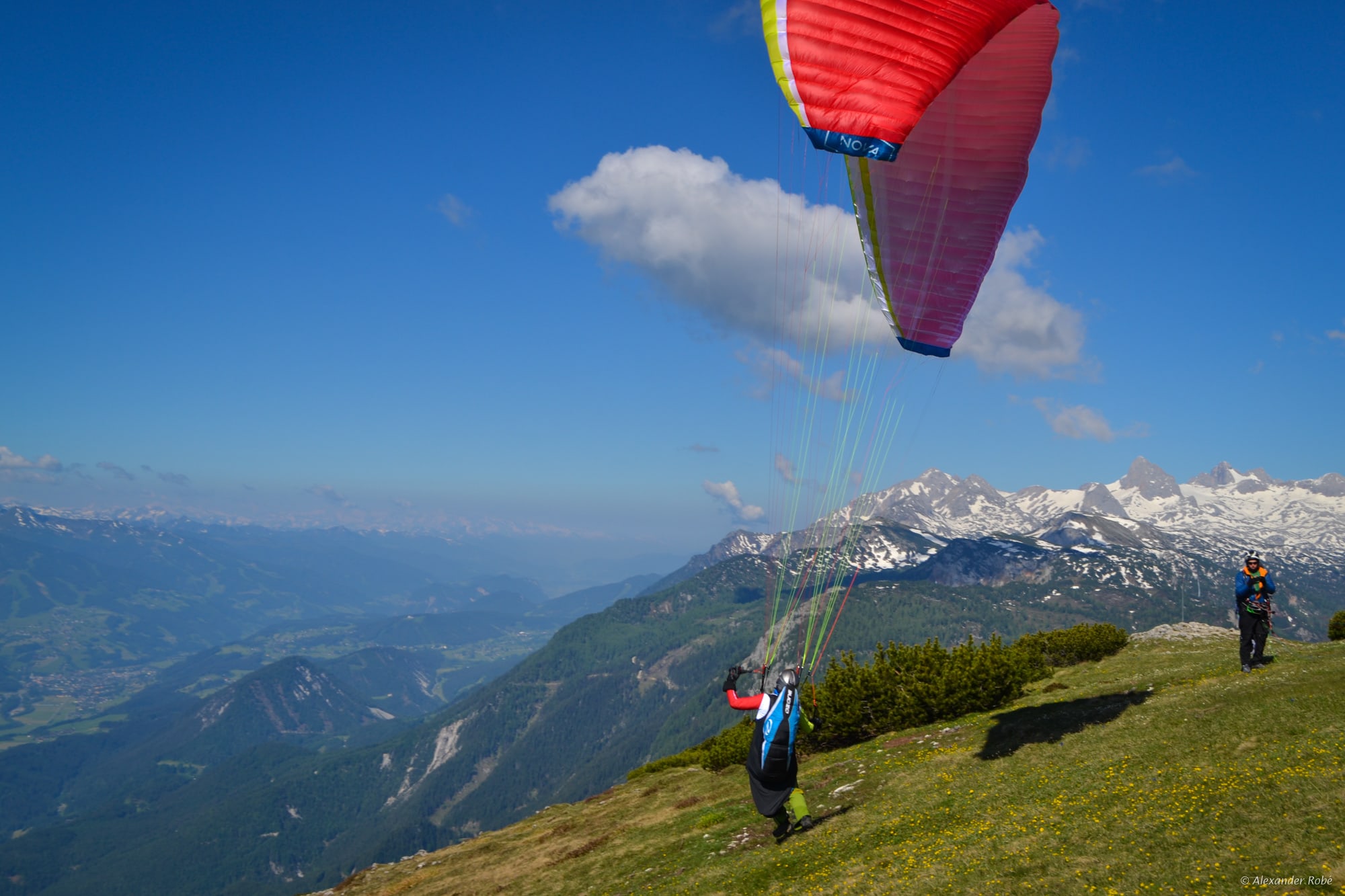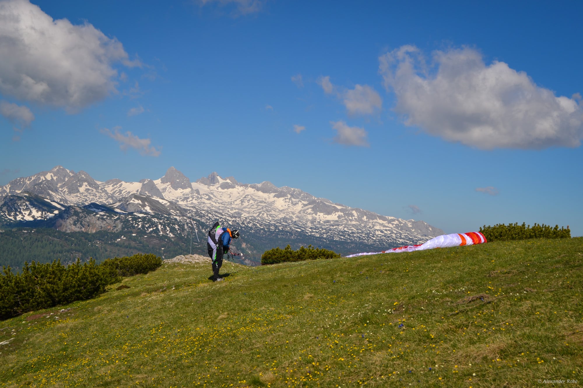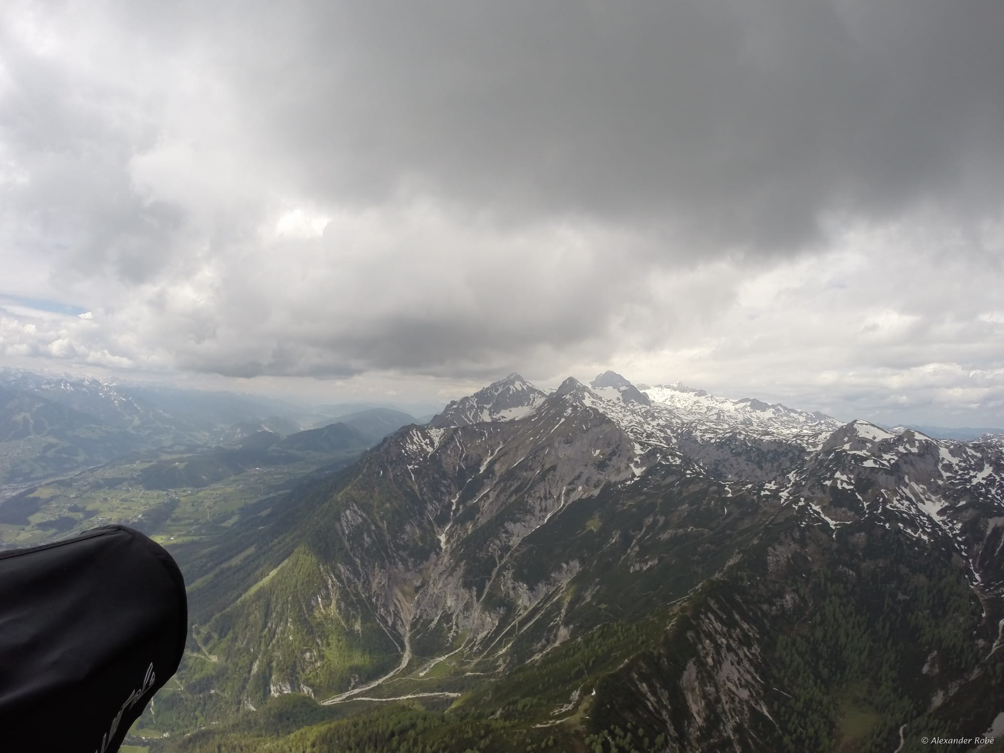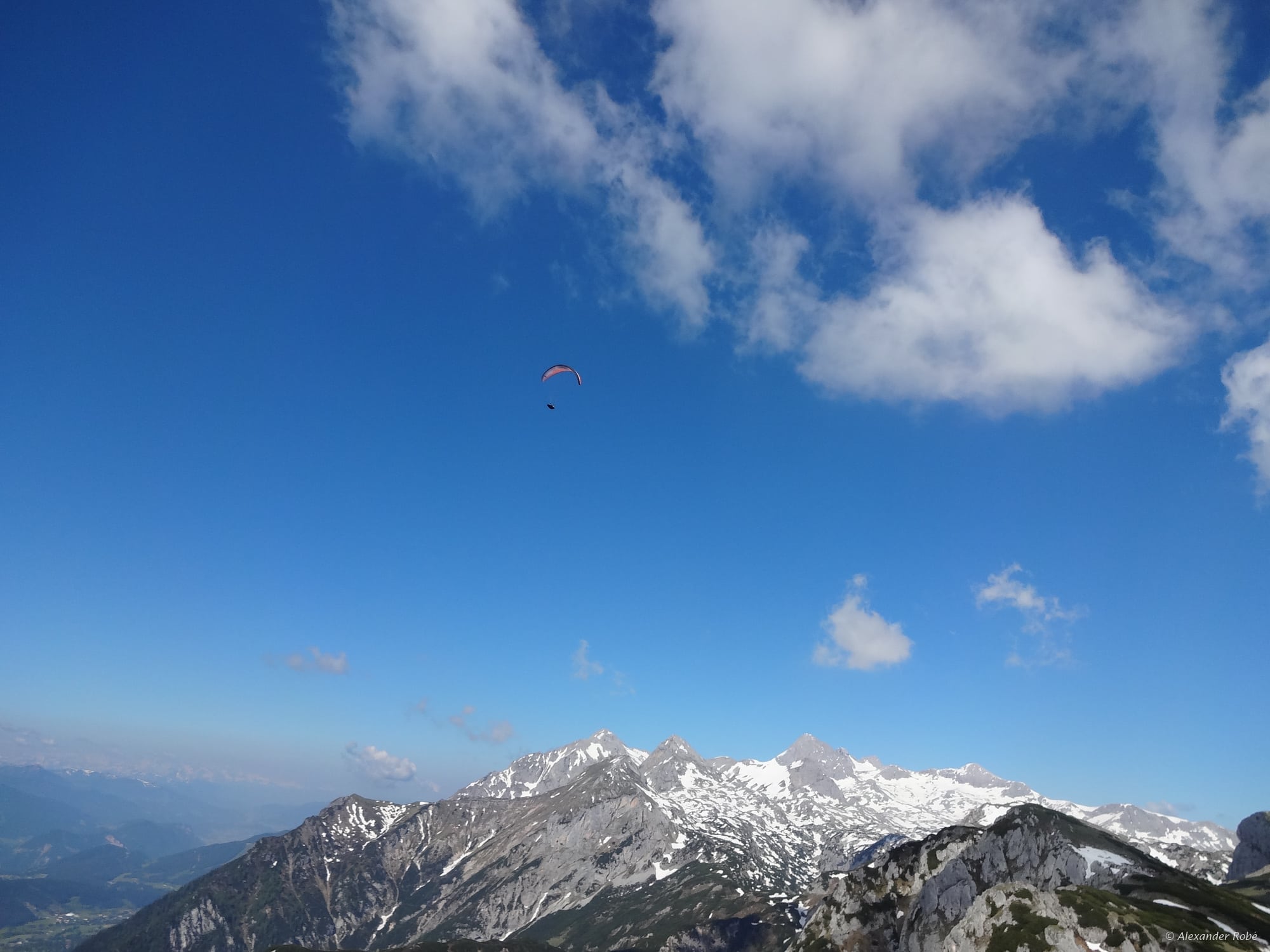 Aber bereits bei Erreichen des Gipfels war klar, dass auch wir heute unsere Chance bekommen sollten: Der Thermikindikator für den Weg gen Westen, der Scheichenspitz (östlich vom Dachstein), zeigte ebenfalls erste Cumulus-Anzeichen!