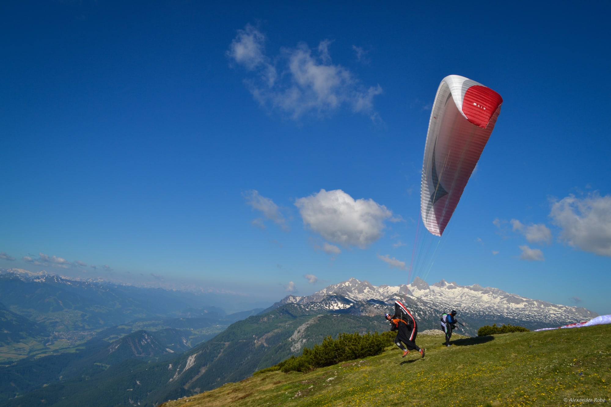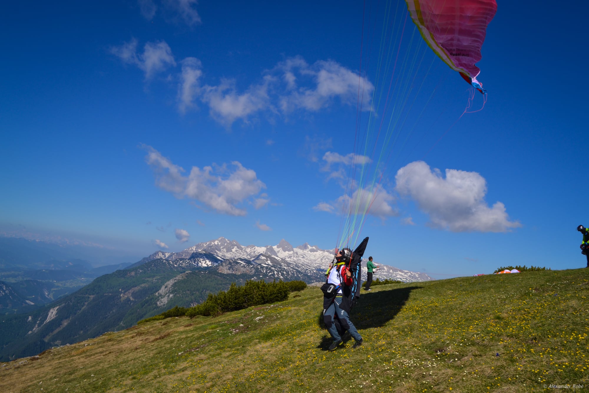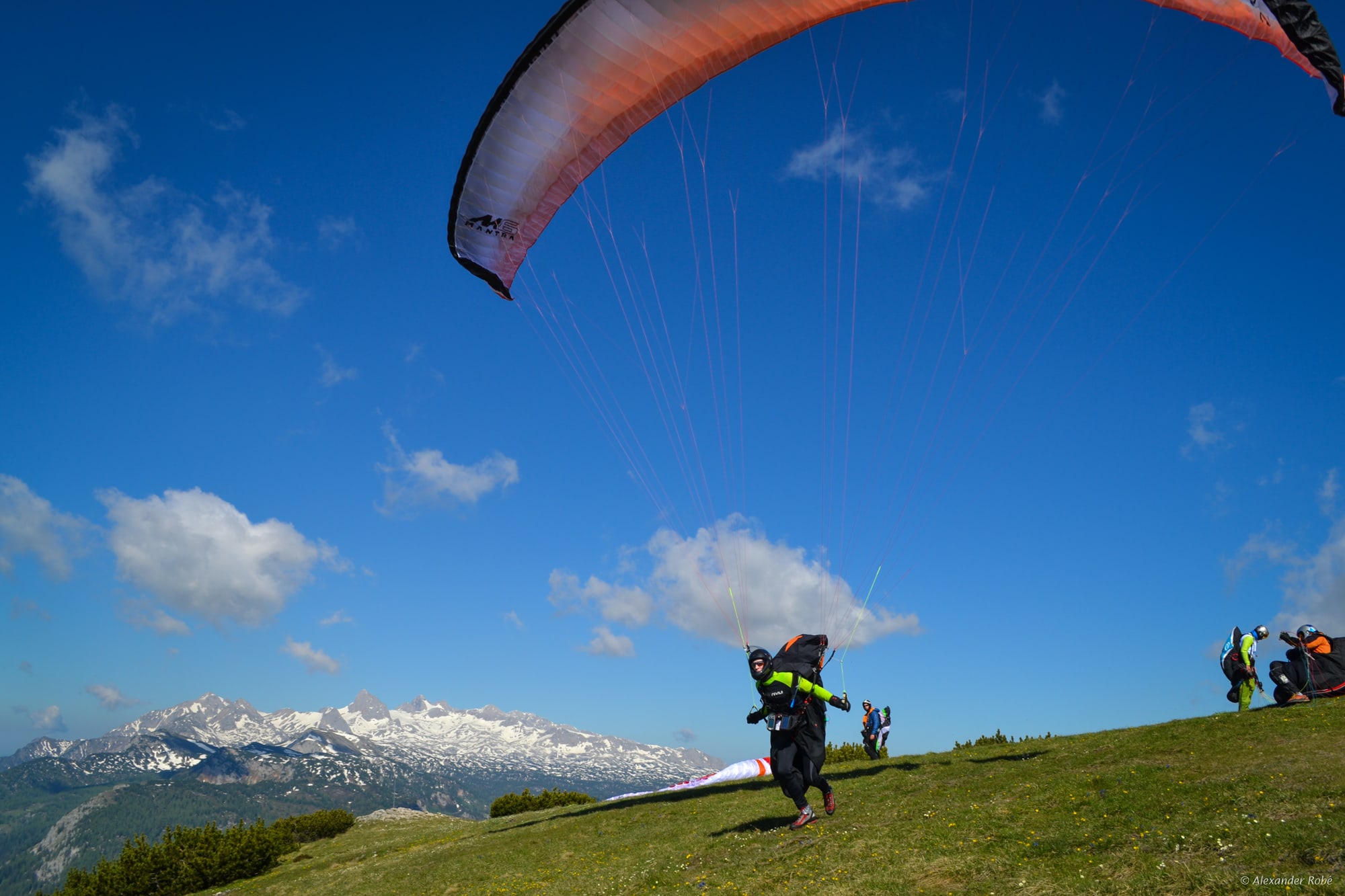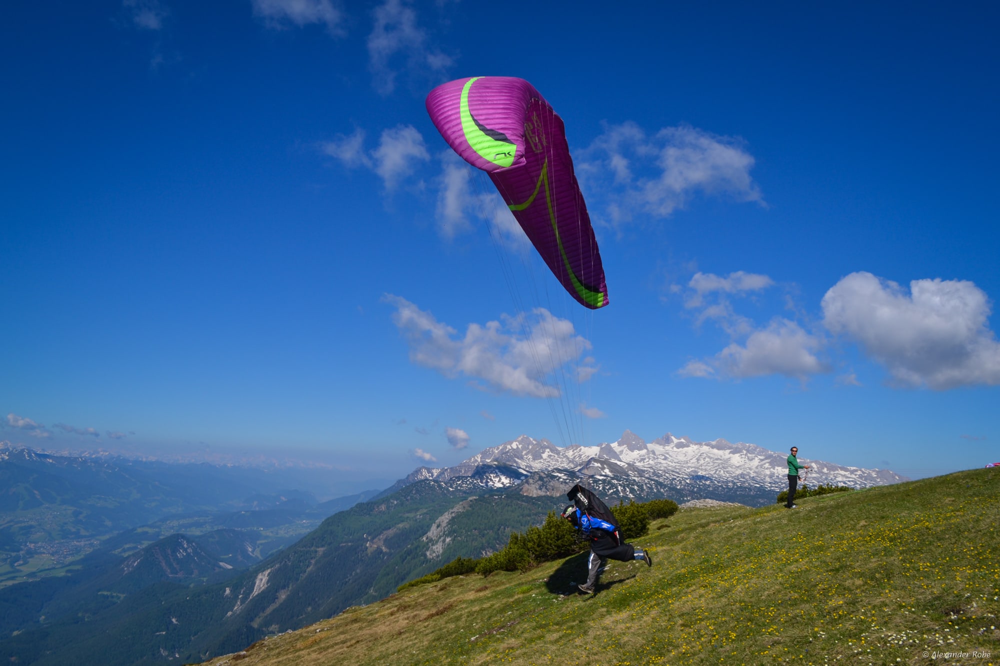 Aber bereits bei Erreichen des Gipfels war klar, dass auch wir heute unsere Chance bekommen sollten: Der Thermikindikator für den Weg gen Westen, der Scheichenspitz (östlich vom Dachstein), zeigte ebenfalls erste Cumulus-Anzeichen!