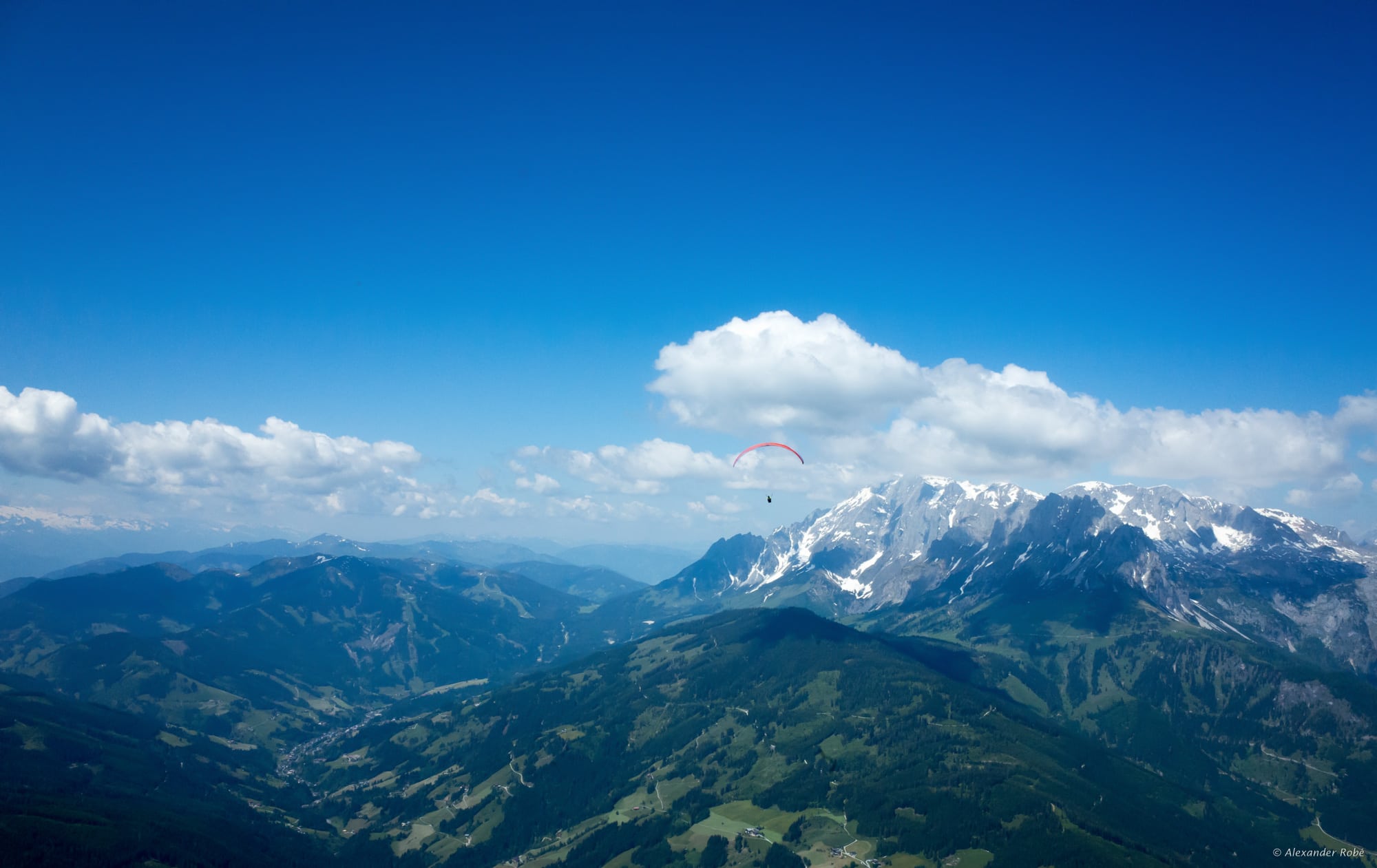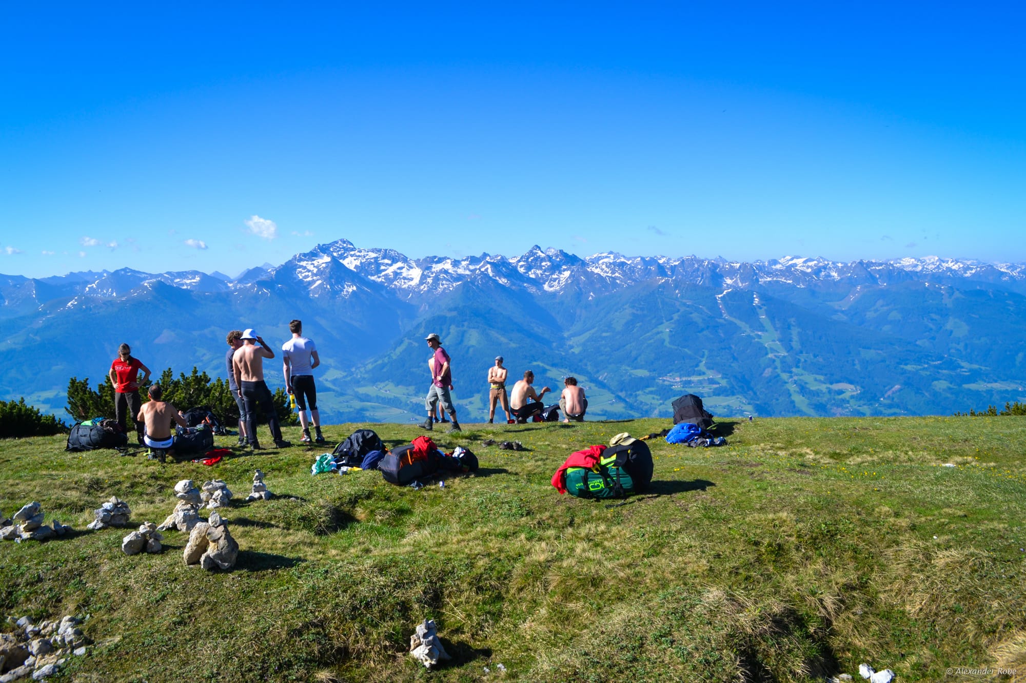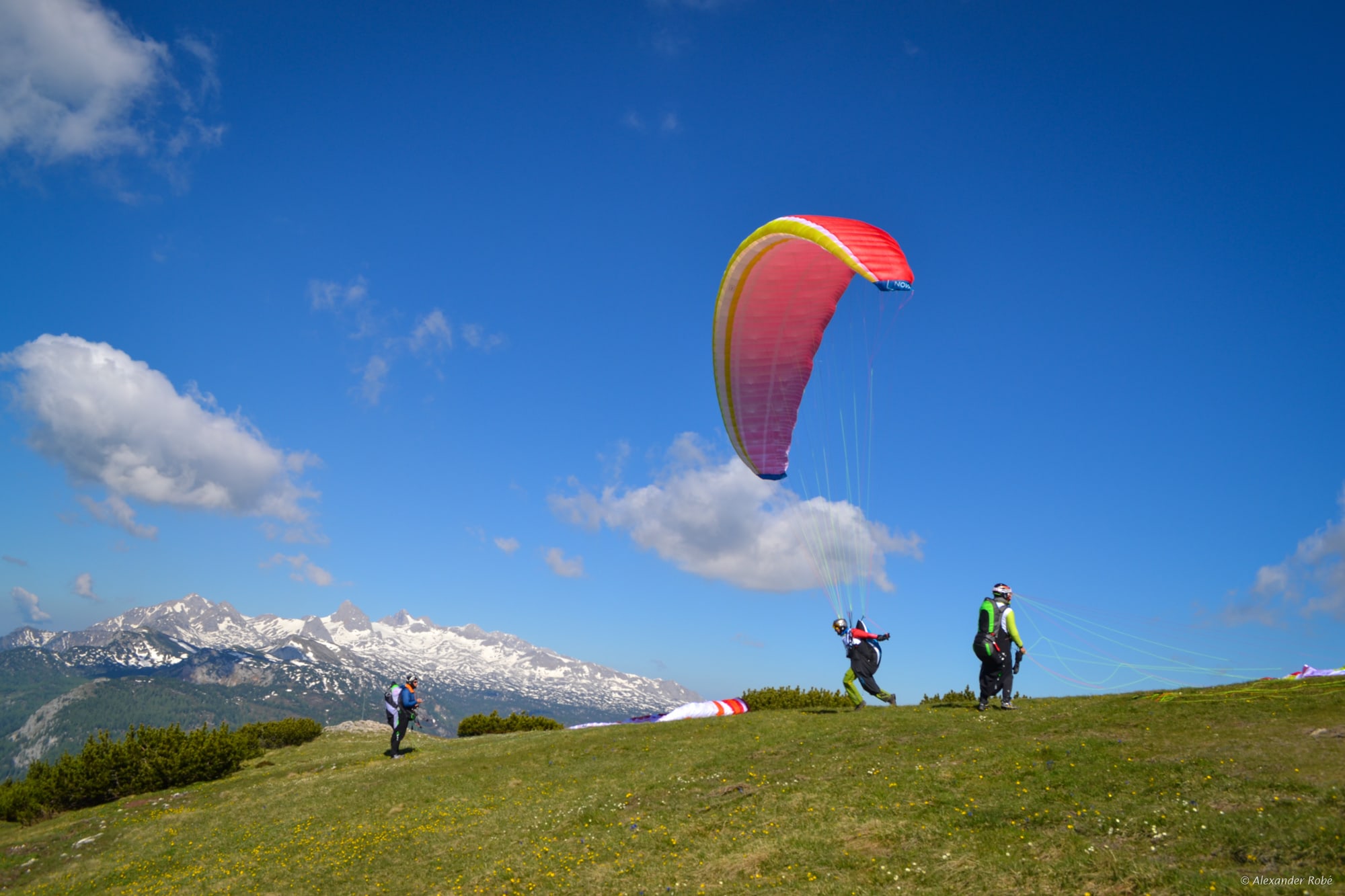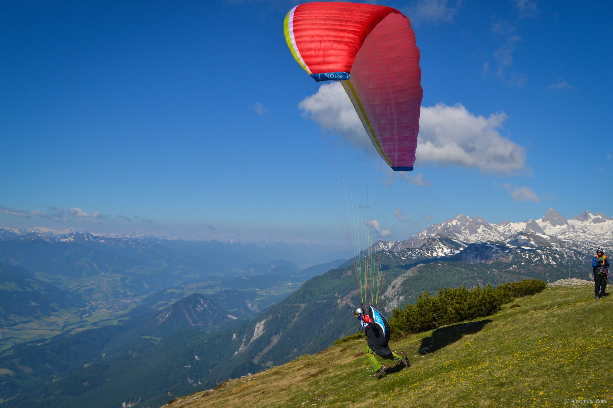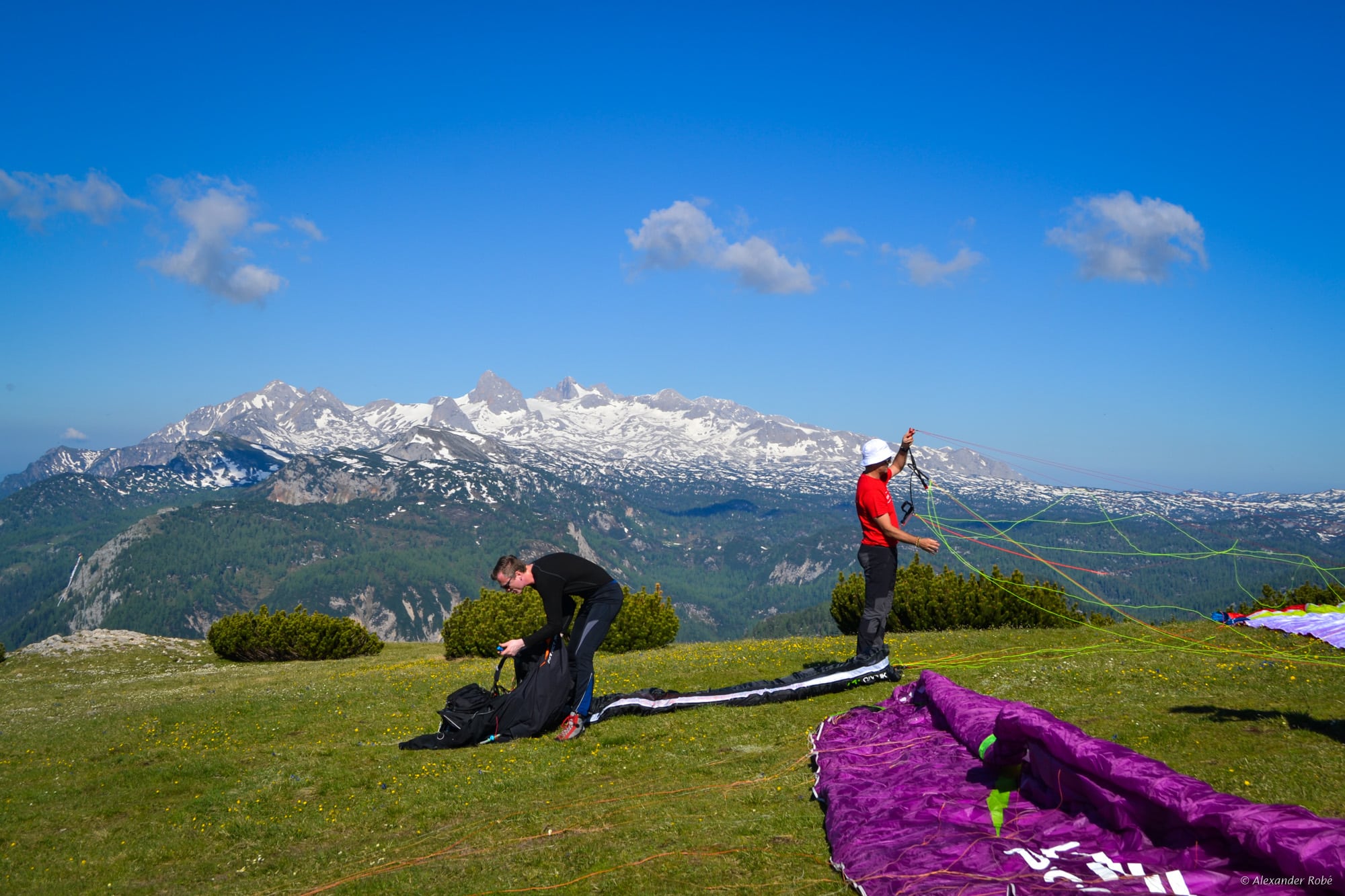 Aber bereits bei Erreichen des Gipfels war klar, dass auch wir heute unsere Chance bekommen sollten: Der Thermikindikator für den Weg gen Westen, der Scheichenspitz (östlich vom Dachstein), zeigte ebenfalls erste Cumulus-Anzeichen!