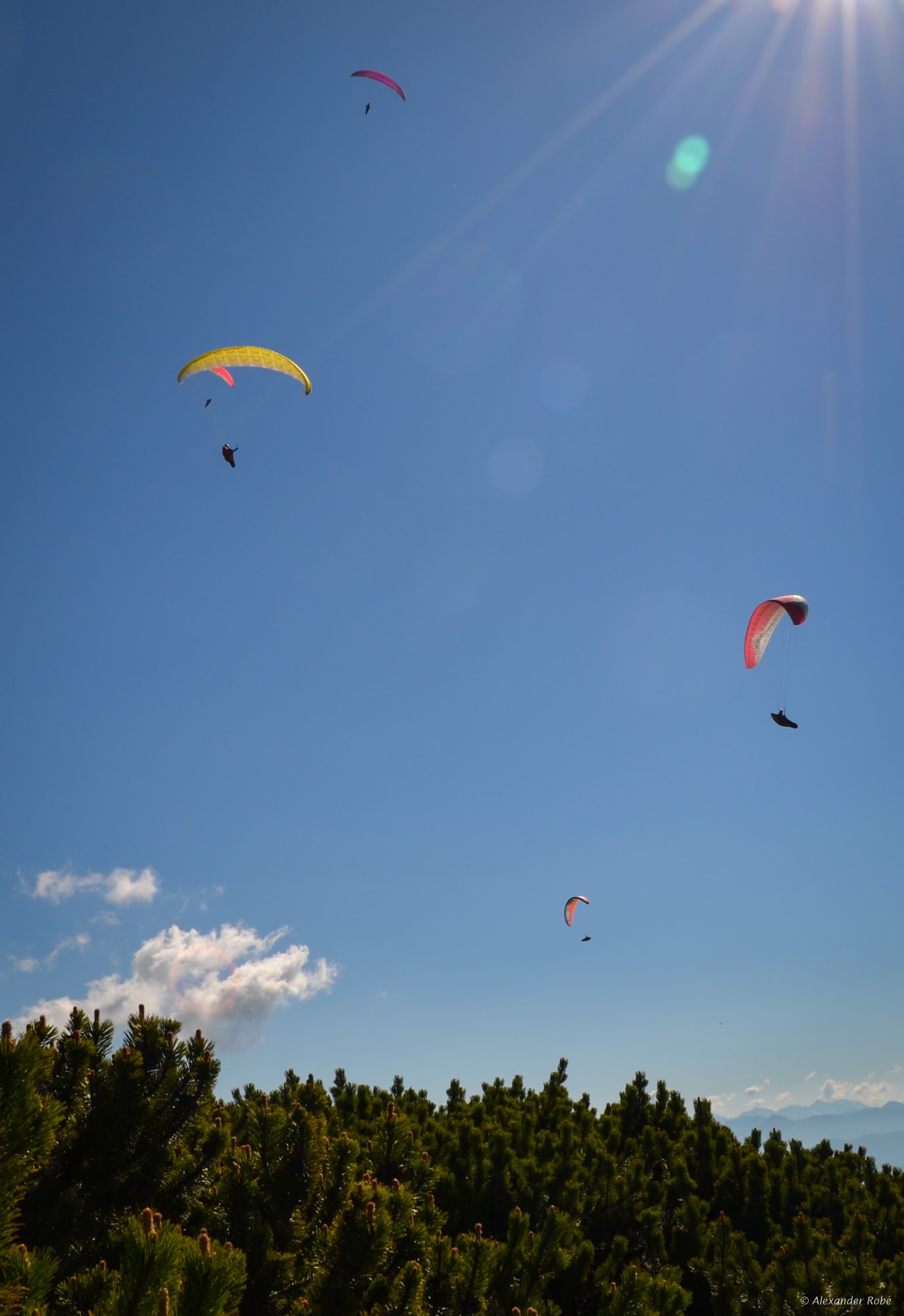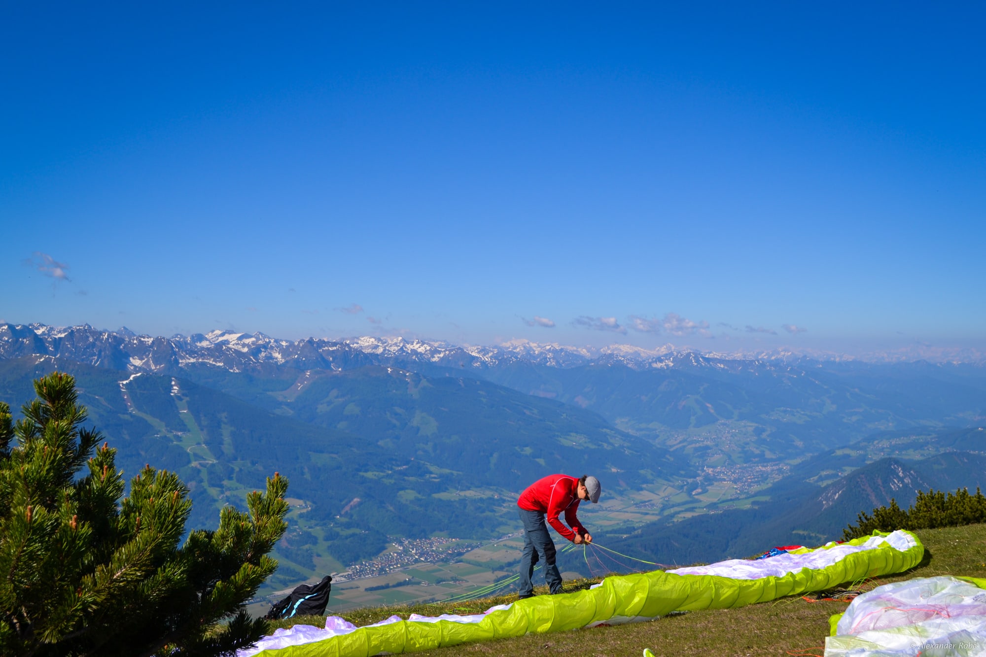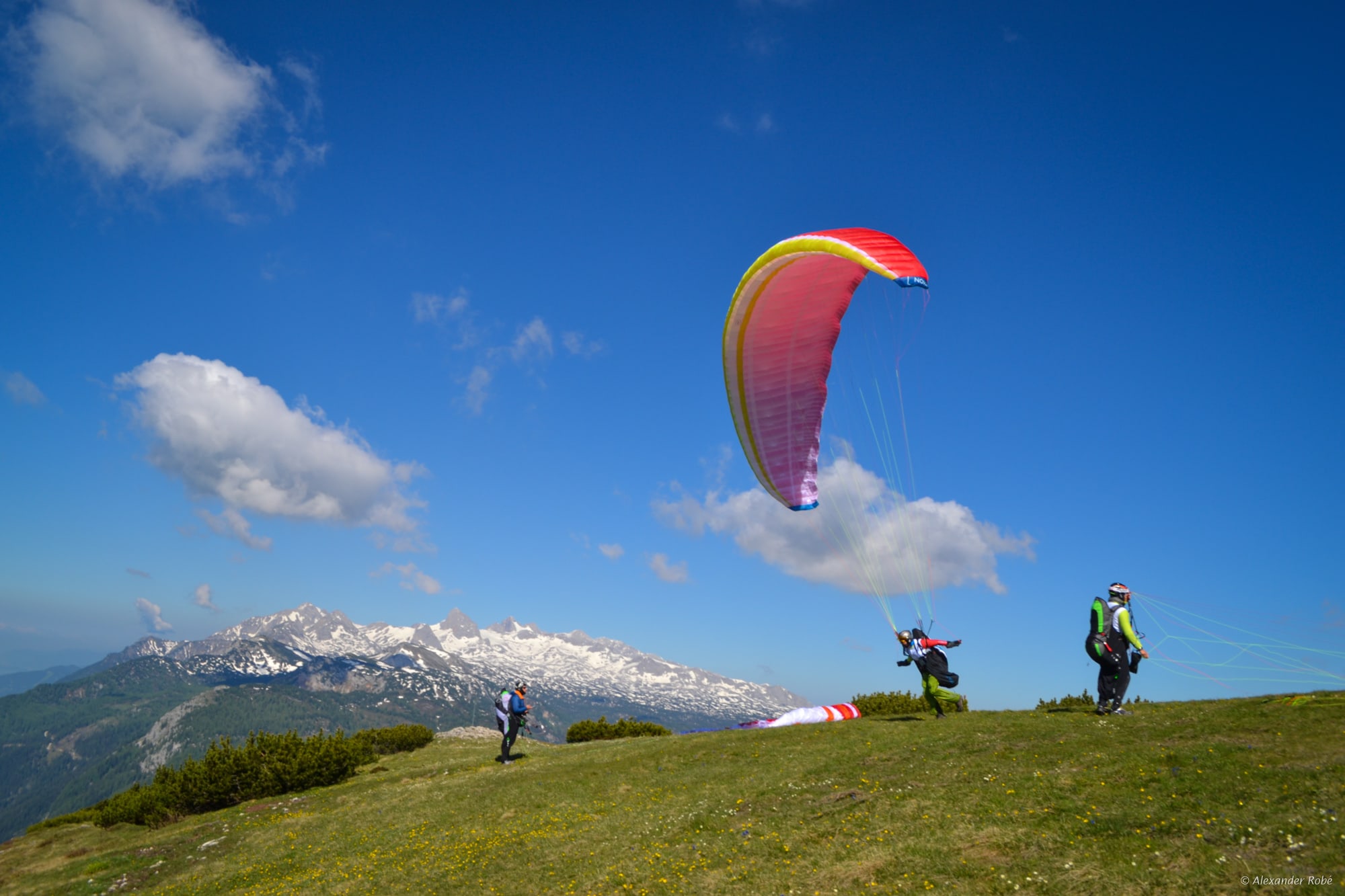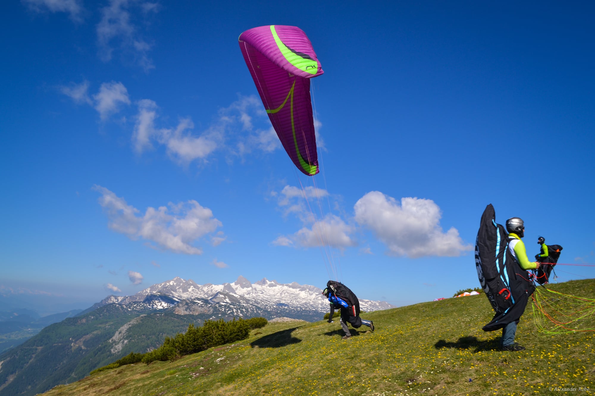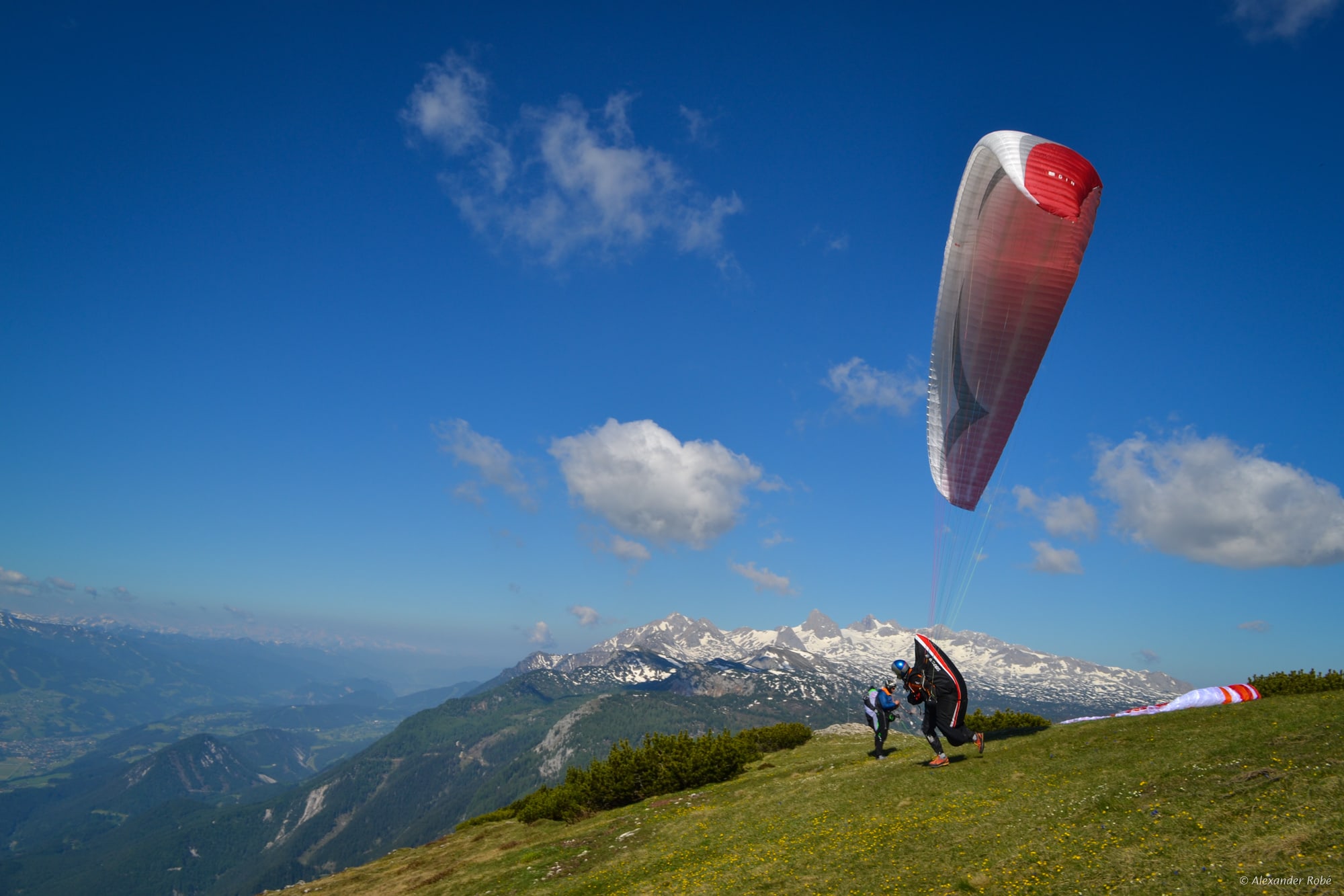 Aber bereits bei Erreichen des Gipfels war klar, dass auch wir heute unsere Chance bekommen sollten: Der Thermikindikator für den Weg gen Westen, der Scheichenspitz (östlich vom Dachstein), zeigte ebenfalls erste Cumulus-Anzeichen!