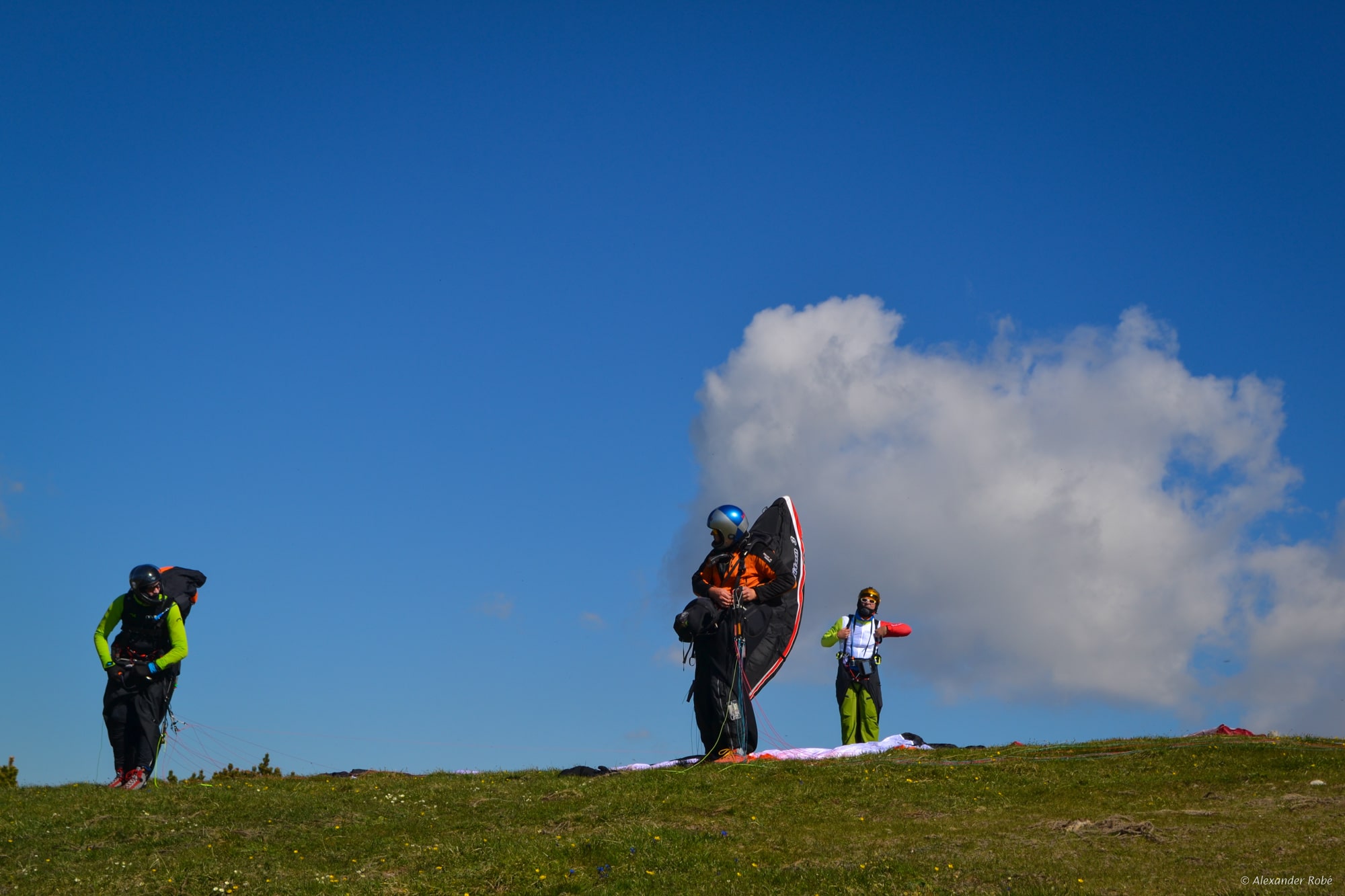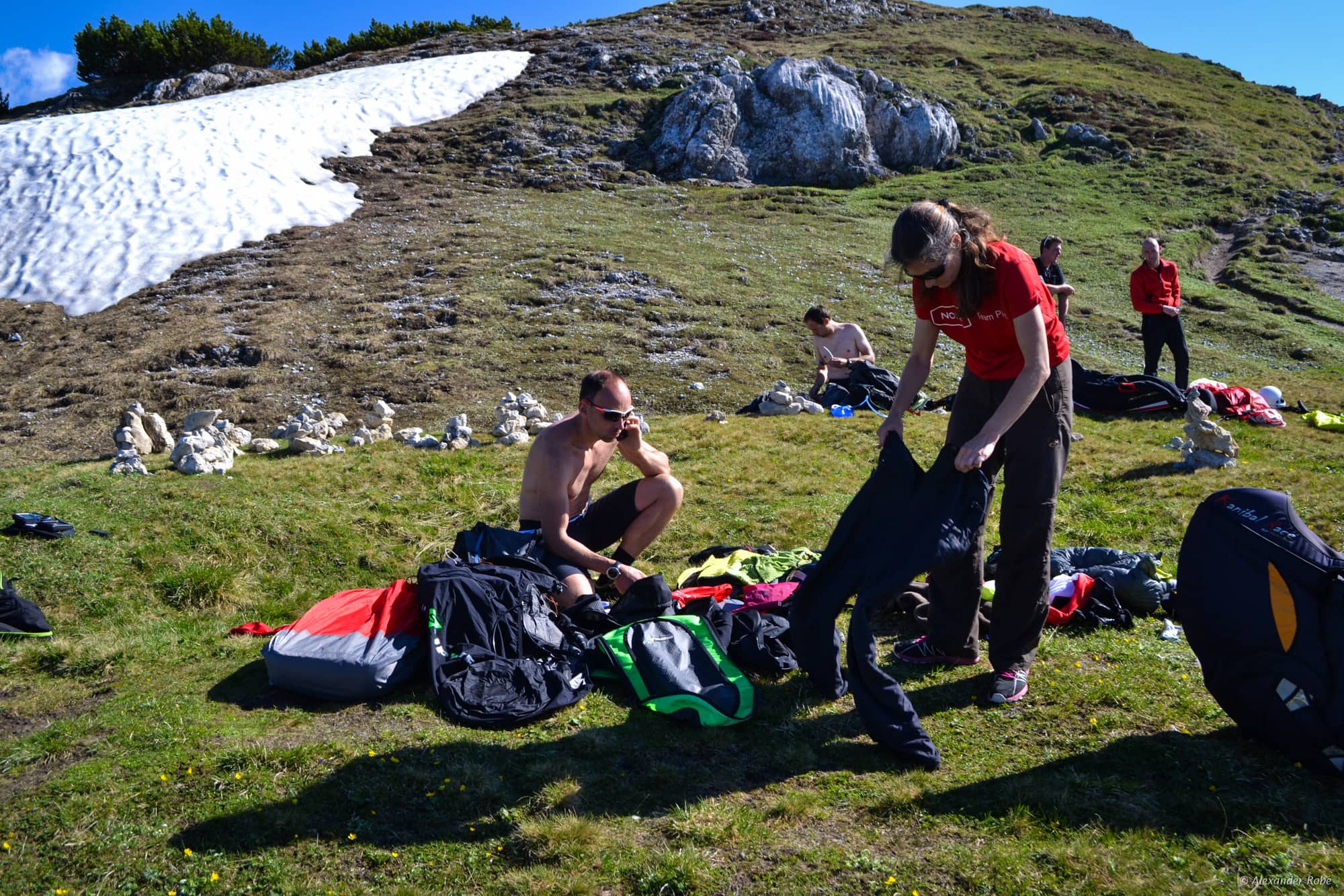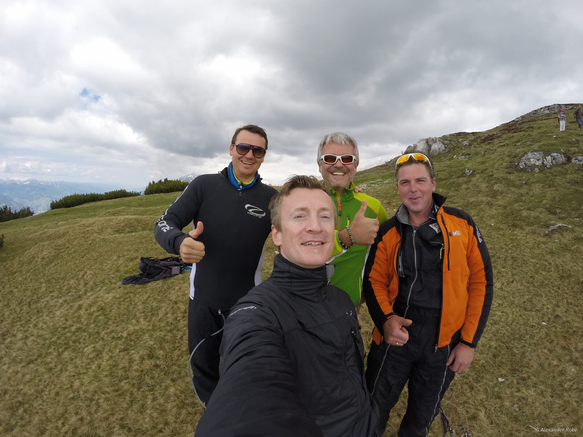 Ein fettes Wolkenband schattete den gesamten Nordalpenbereich derart ab, dass Jörg Lasser und ich wieder mit dem Gedanken spielten, den Urlaubstag doch wieder in einen Arbeitstag umzuwidmen. Dem Gruppenzwang und der guten Stimmung war es schließlich geschuldet, dass wir beide dann doch mit Ralf Kahr-Reiter, Walter Wilding, Werner Luidolt und Hannes Zettler gen Himmel fuhren, weiterwanderten, uns startbereit machten – und erst mal warteten…