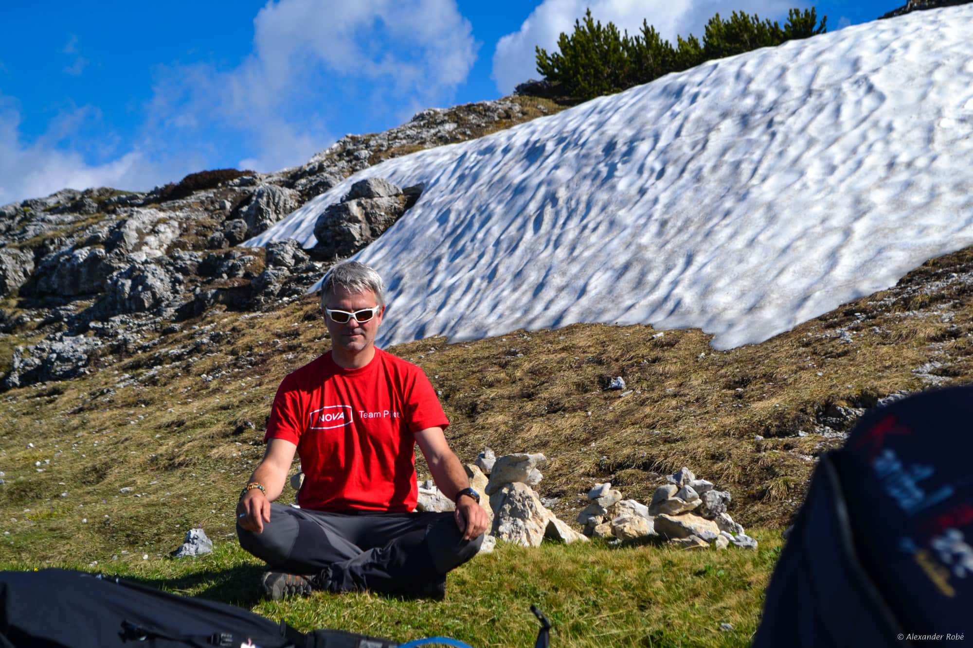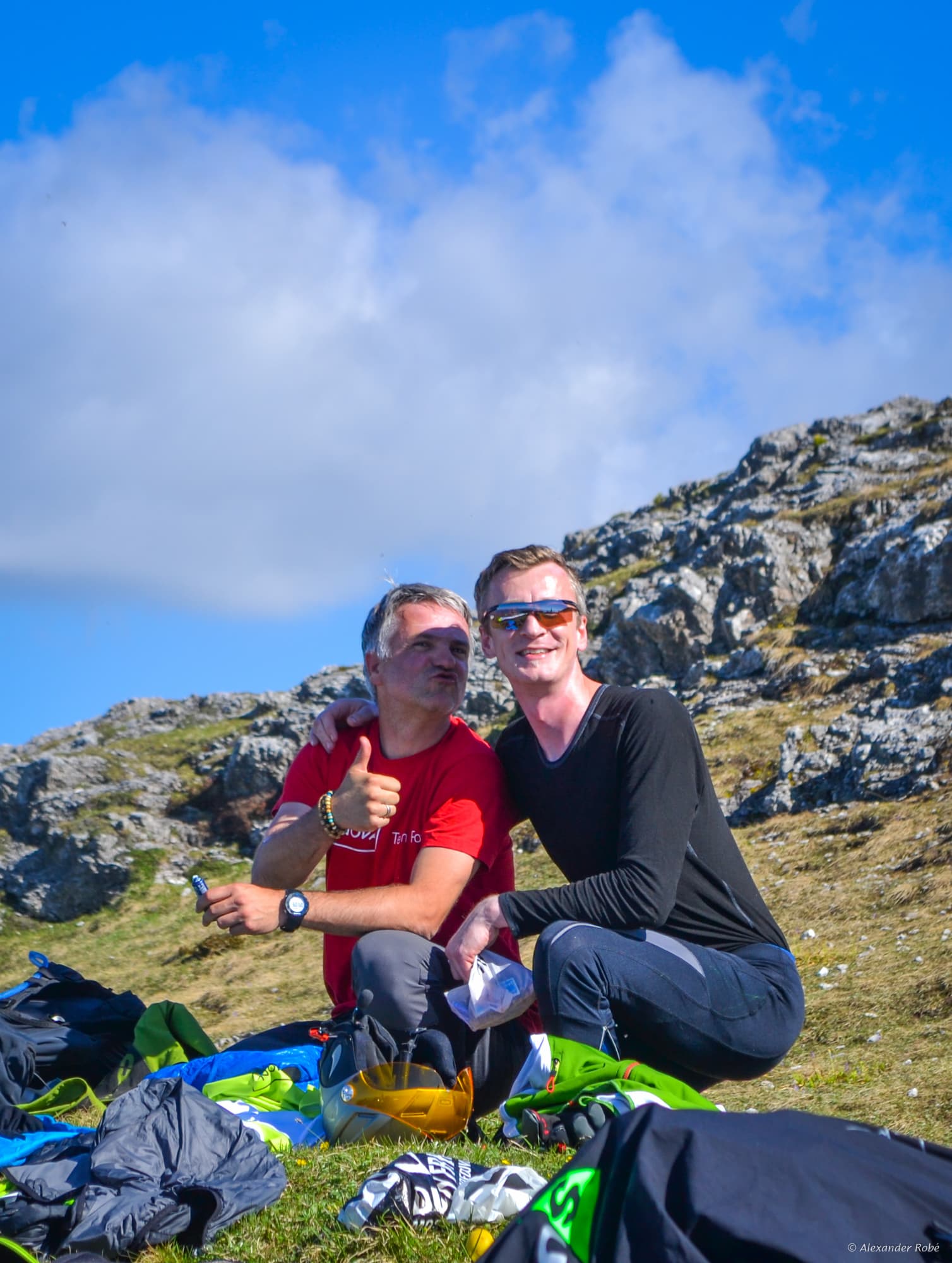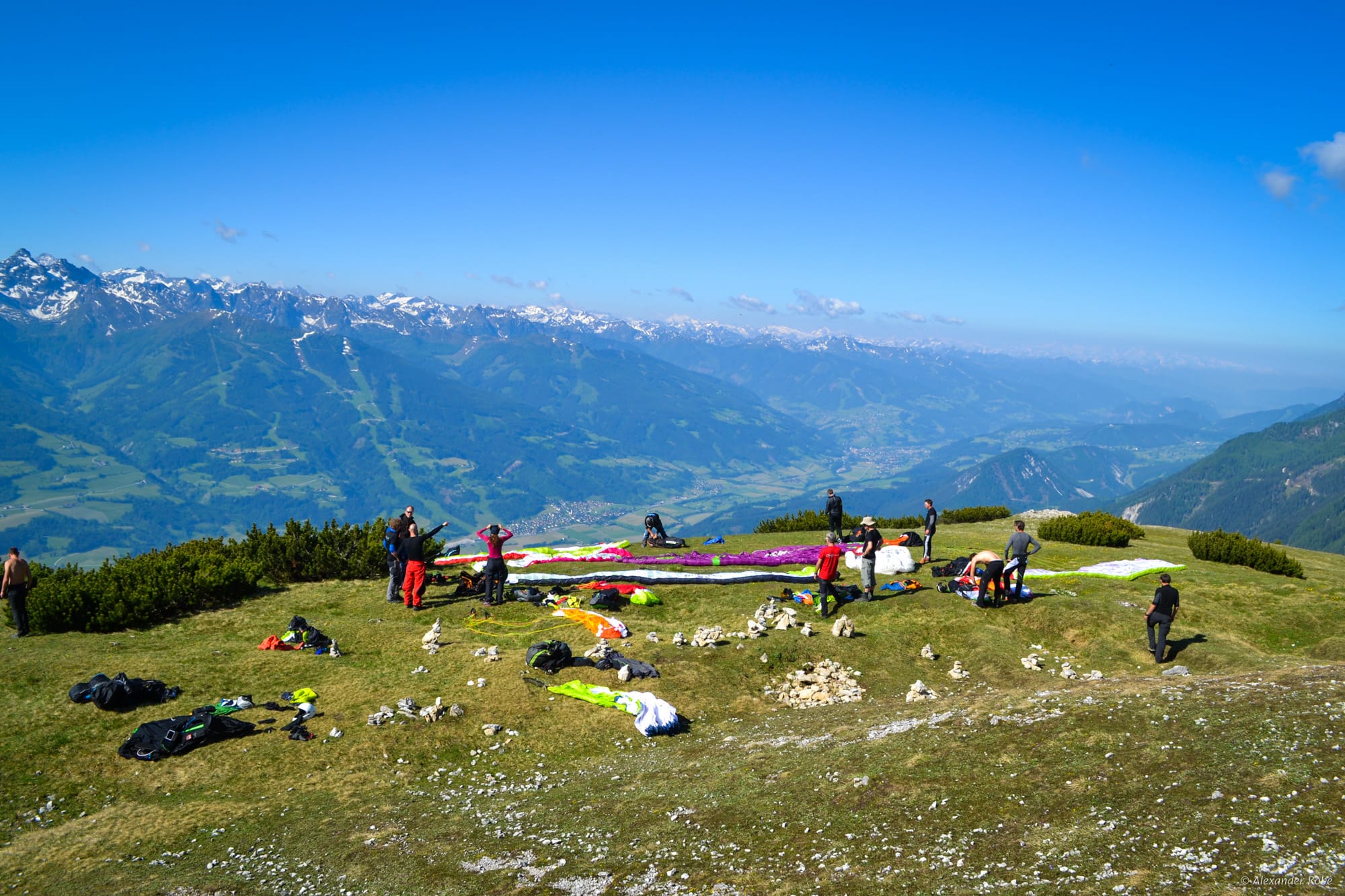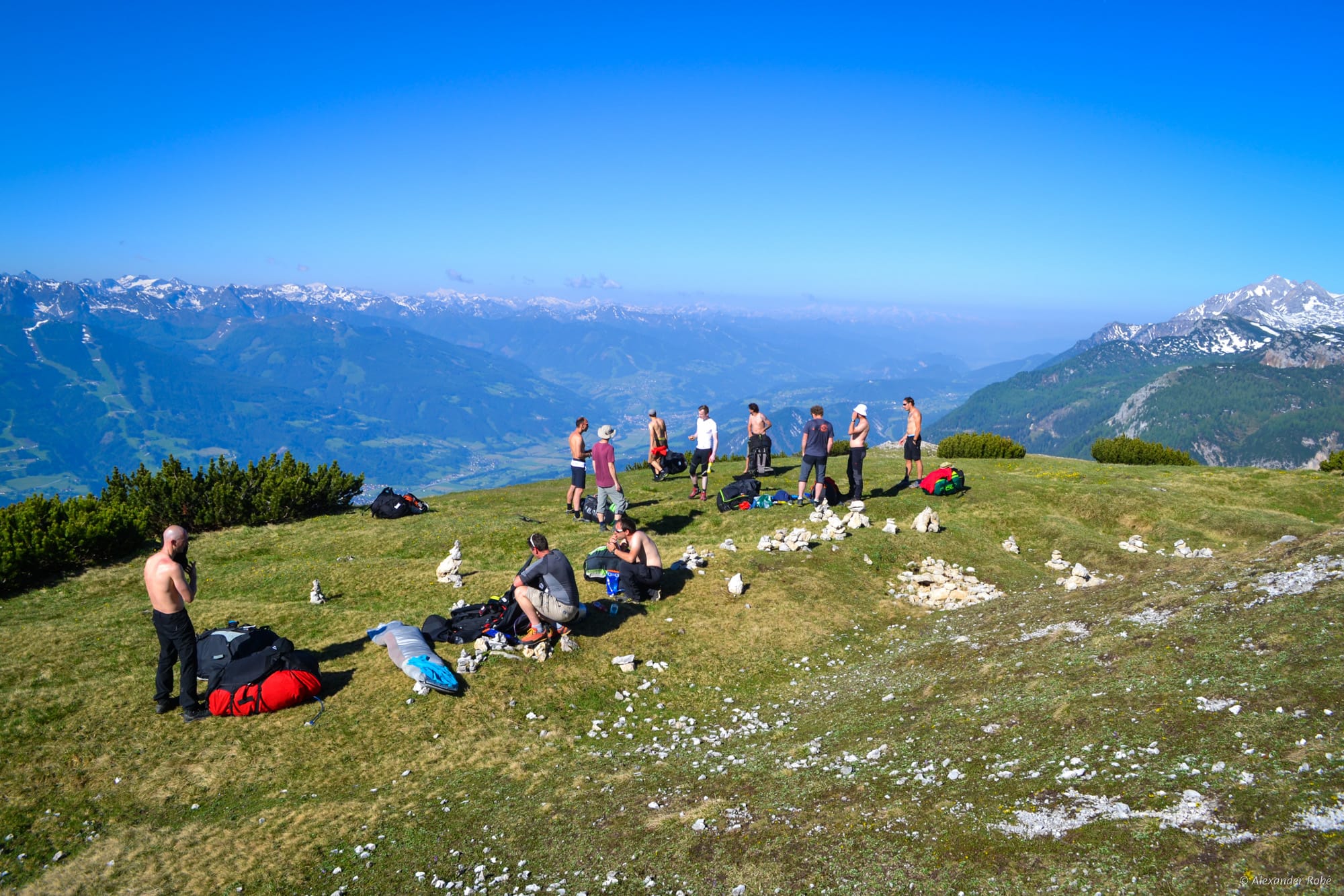 Ein fettes Wolkenband schattete den gesamten Nordalpenbereich derart ab, dass Jörg Lasser und ich wieder mit dem Gedanken spielten, den Urlaubstag doch wieder in einen Arbeitstag umzuwidmen. Dem Gruppenzwang und der guten Stimmung war es schließlich geschuldet, dass wir beide dann doch mit Ralf Kahr-Reiter, Walter Wilding, Werner Luidolt und Hannes Zettler gen Himmel fuhren, weiterwanderten, uns startbereit machten – und erst mal warteten…